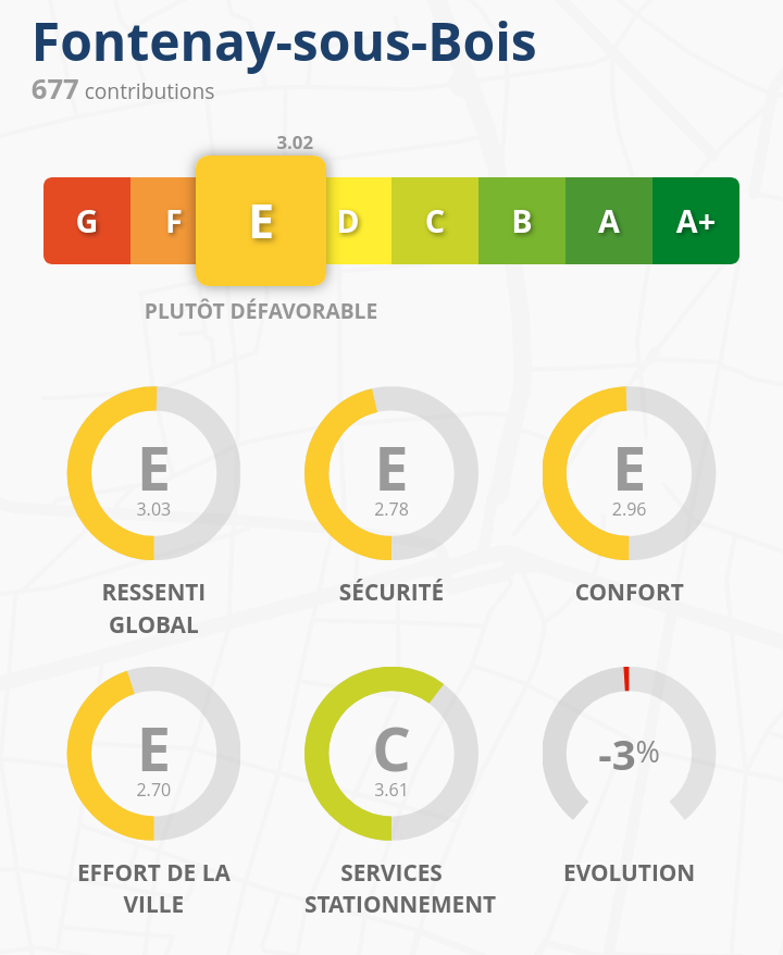 La note globale attribuée à Fontenay reste E (« plutôt défavorable »), comme en 2019 et 2021, avec une évolution en baisse (–3 %).